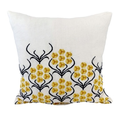 Elegant broderikit med stiliserede gule blomster og grafiske, sorte stilke. Motivet skaber struktur, rytme og lethed, perfekt som blikfang på sofa, seng eller lænestol.