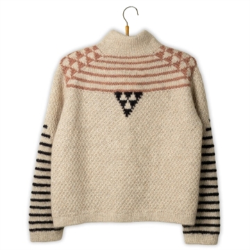 Designet er inspireret af Marianne Isagers 1980’er-skitse Skæl og af Alice i Eventyrland, afspejlet i farverne beige, sort og gammelrosa. Trekantede former og sorte linjer skaber et grafisk udtryk. Jakken er strikket i Isager Jensen Yarn med Isager Silk Mohair og færdiggøres med dobbeltstrikkede kanter og knapper.