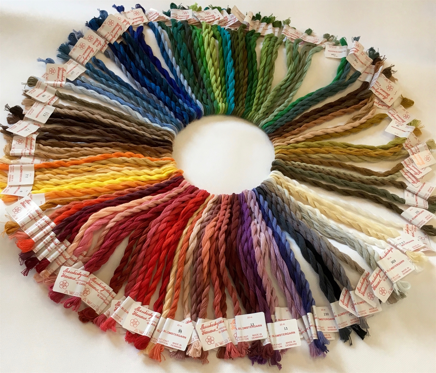 Dansk Blomstergarn produceres af Haandarbejdets Fremme. Der findes 125 farver i Dansk Blomstergarn. Hvis du syr med 1 tråd Dansk Blomstergarn, passer dette til et 10- til 13-trådet hørlærred eller Aida stof med 5,4 - 6,4 huller pr cm. Syr du med to tråde Dansk Blomstergarn, kan du anvende Hørlærred 7,5 tråde pr cm eller Aida 4,4 huller pr cm.