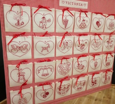 Jubilæumskalender tegnet af H.M.Dronningen til Haandarbejdets Fremmes 90 års jubilæum. Pakkekalender med 24 flotte broderede lommer. Mål: 93 x 105 cm.