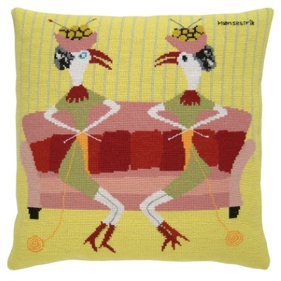 Pude broderi med humor fra Fru Zippe. Motivet viser to "hønsestrikkere" og leder tankerne hen på 70'ernes hønsestrik som bl.a. var et af symbolerne på 68-generationens oprør mod normer.