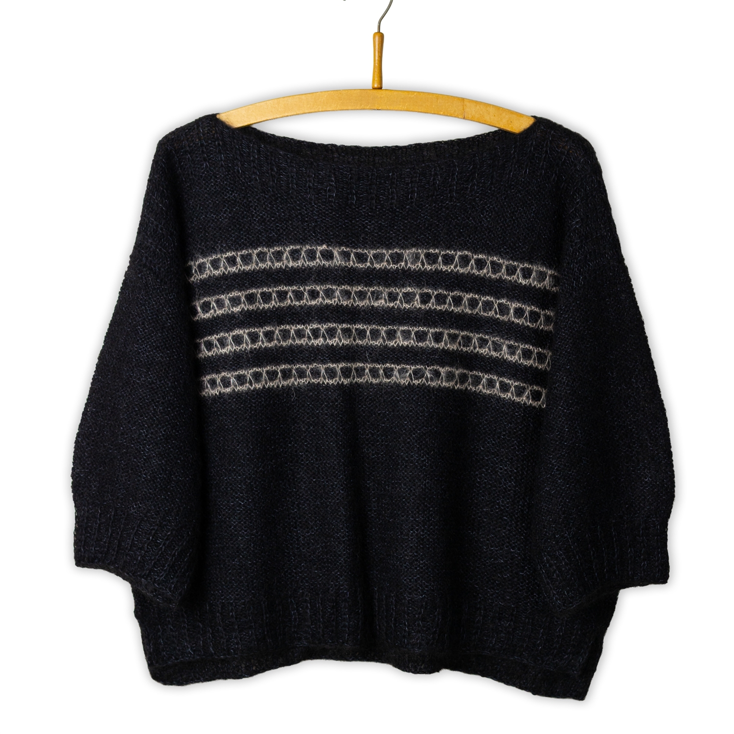 farve Ink) og 150 (150) 175 (175) 175 (200) 225 (225) 250 g Isager Silk Mohair (farve 30). De to tråde strikkes sammen.